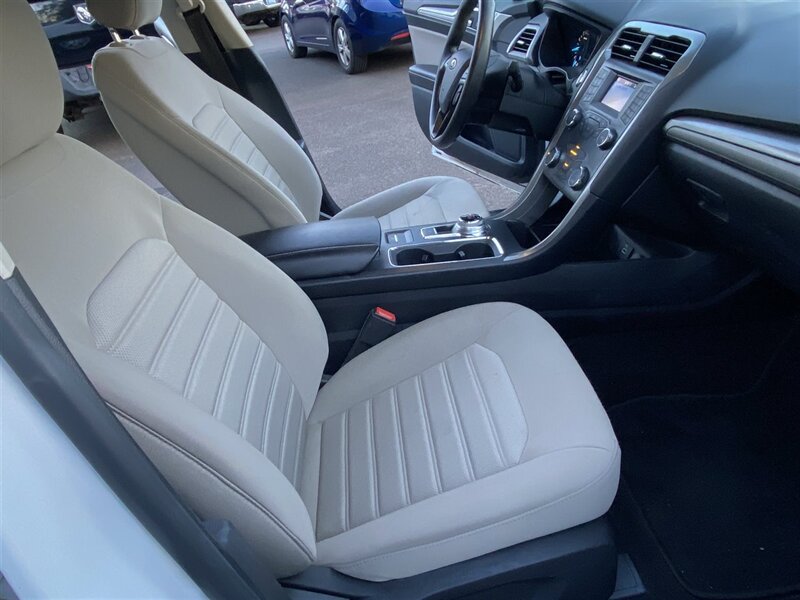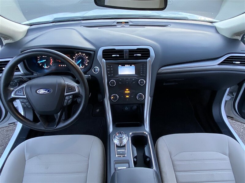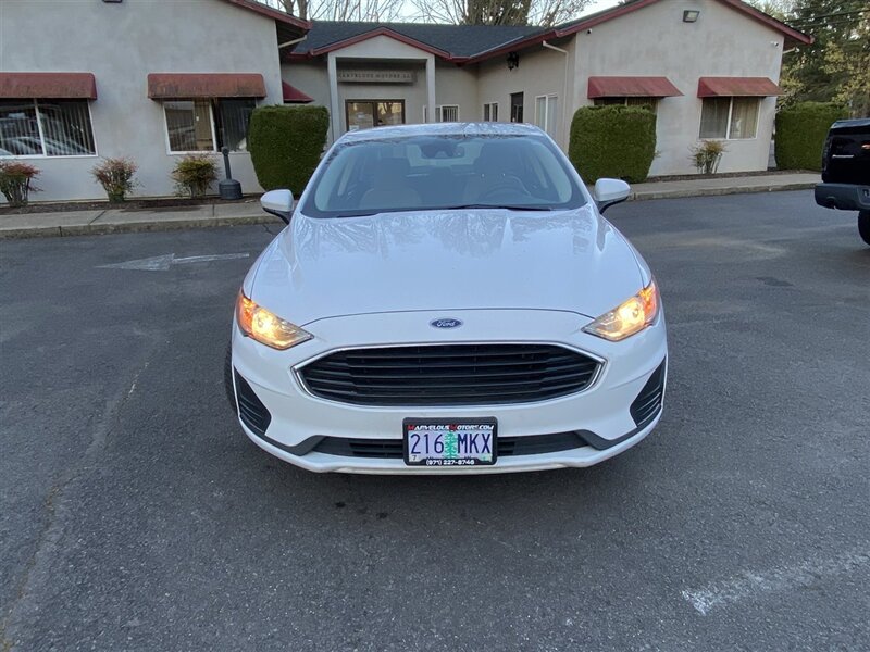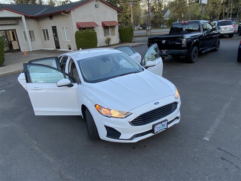 2020 Ford Fusion S — Oxford White exterior, Gray cloth interior. Powered by a reliable 2.5L inline-4 engine producing 175 hp and 175 ft-lbs of torque, paired with a smooth-shifting 6-speed automatic transmission and front-wheel drive. EPA-rated at 21 MPG city and 31 MPG highway, this Fusion delivers balanced everyday performance and efficient highway cruising.